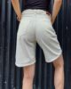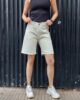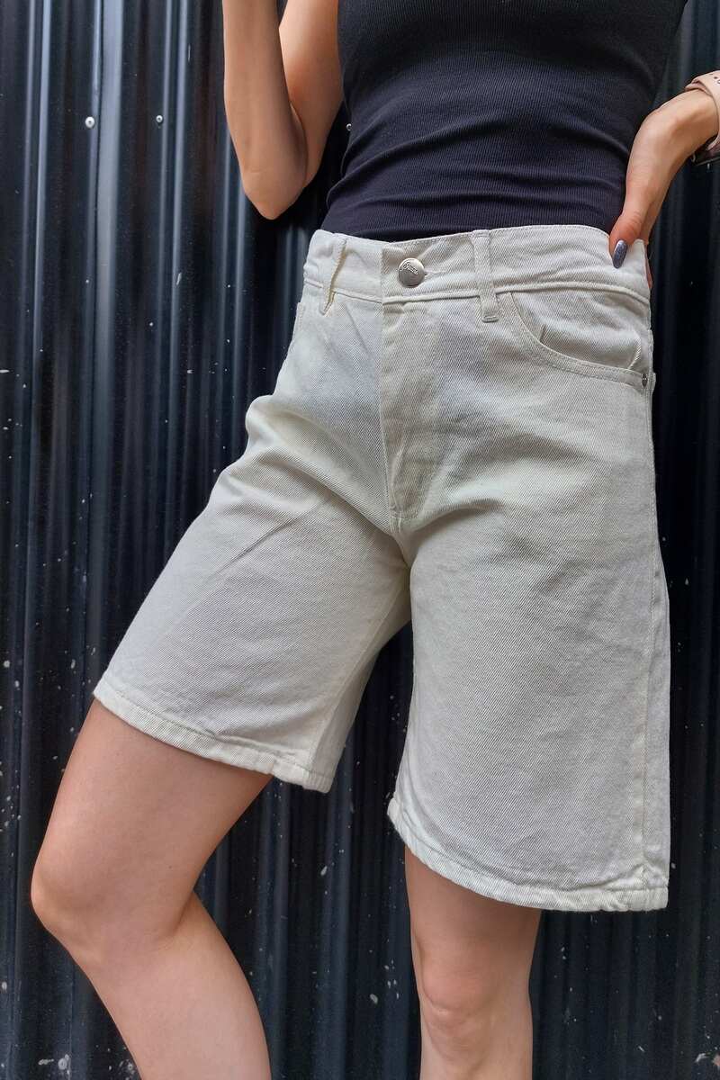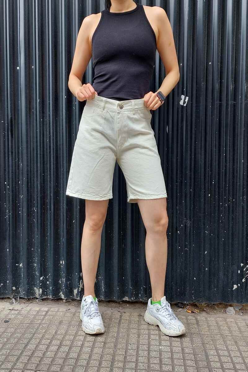 Pantalón corto (sobre las rodillas) denim rígido con bolsillos delanteros y traseros . Tiene pasacinto, cierre y botón. Debajo del canesú tiene dos pinzas sobre el bolsillo para un mejor calce.