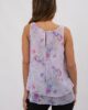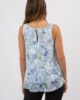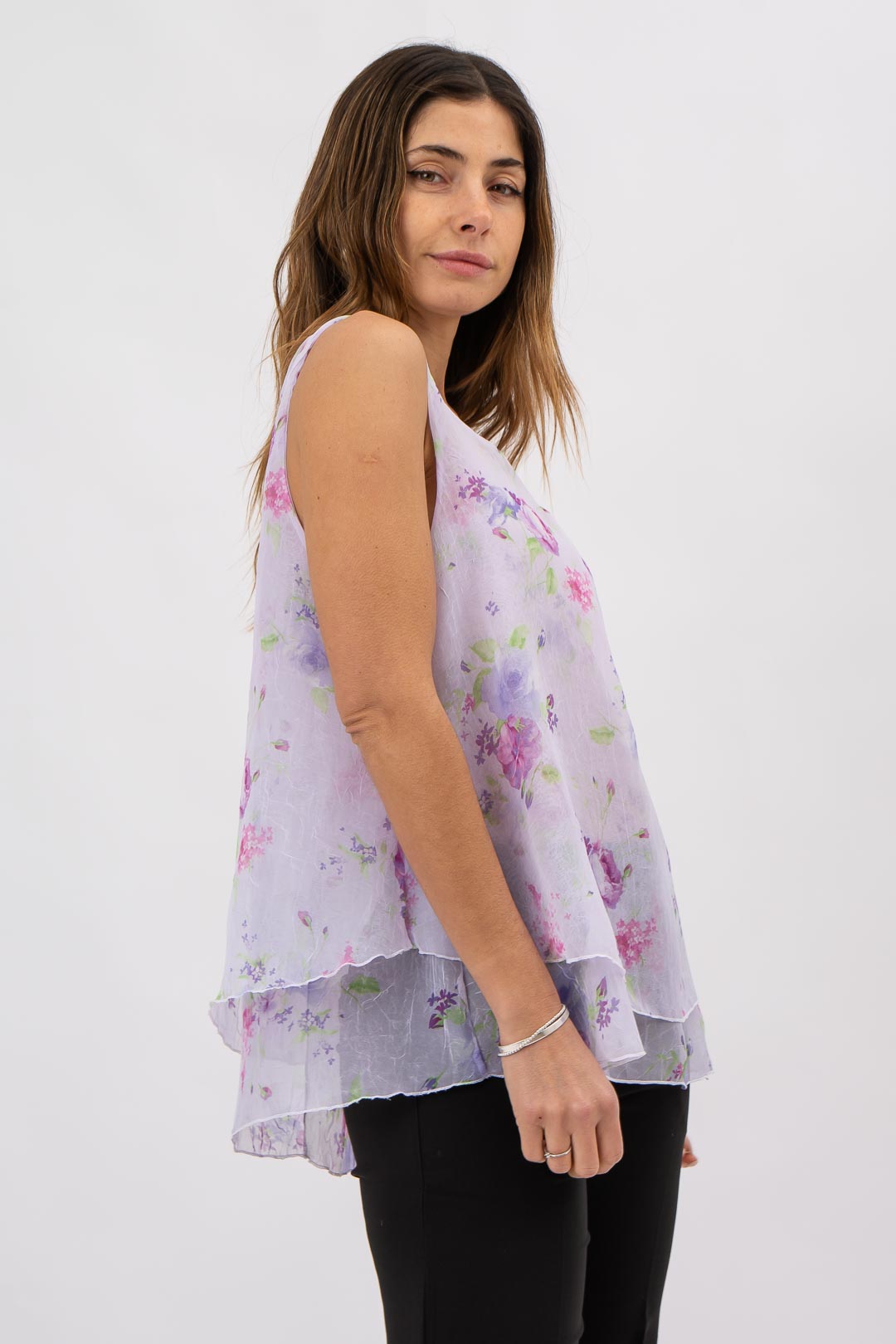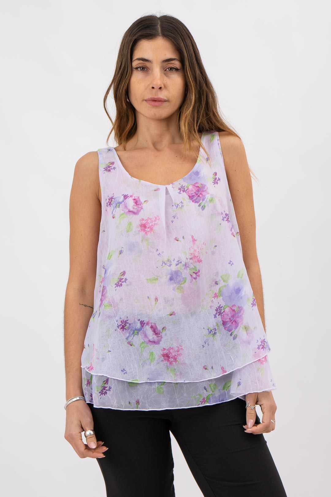 Blusa evasé sin mangas de gasa crepe estampada, doble capa, cuello redondo y pinza en el centro del escote. Espalda unida con botón dorado.