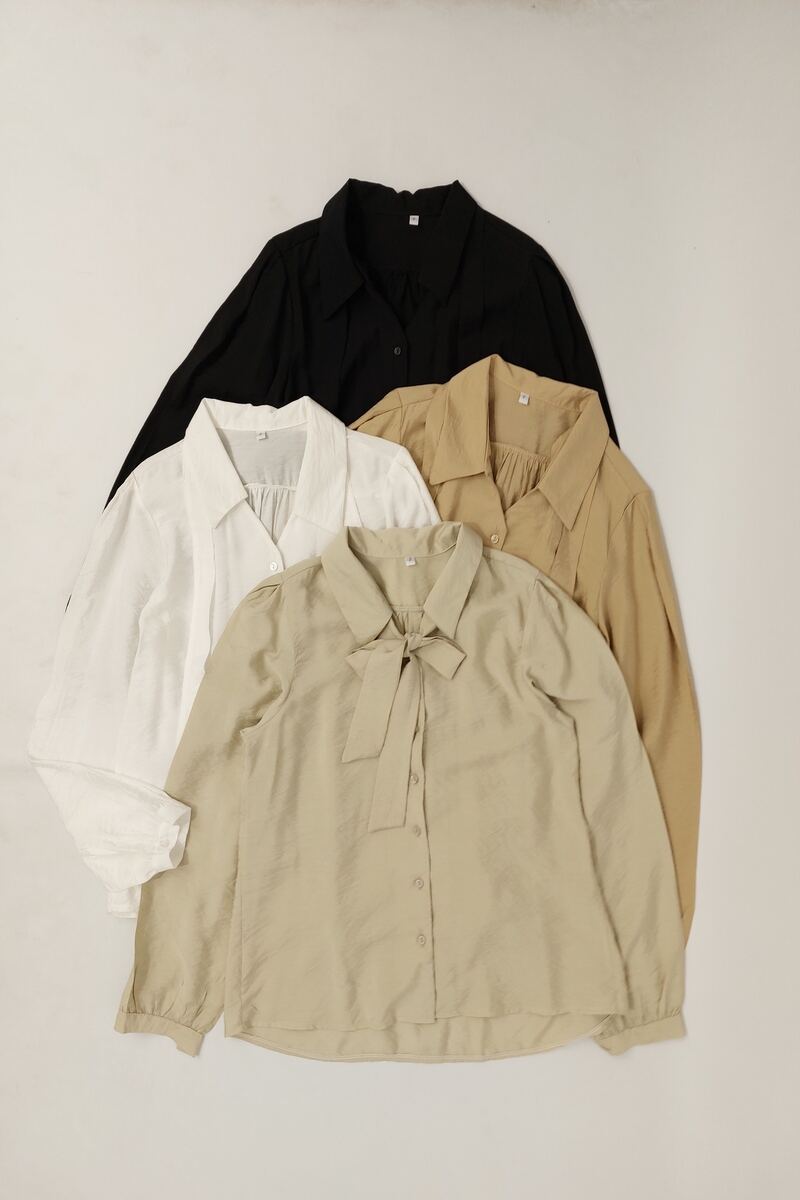 camisa de seda arrugada con lazo en el cuello.