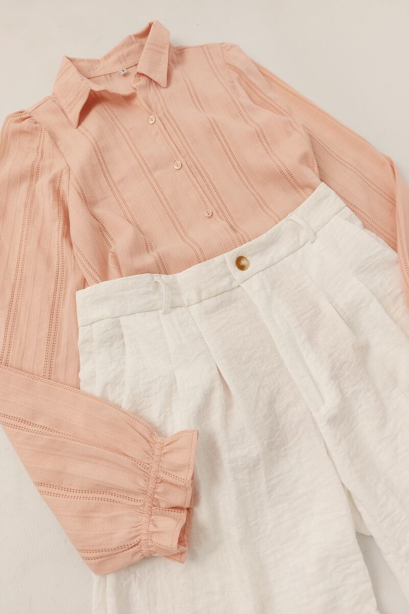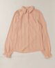 Camisa mangas largas hecho con una tela plana de algodón calado, que tiene un frunce en el hombro para dar ese volúmen y en la muñeca tiene un efecto volado al coser un elástico de un 1 cm a 4 cm del extremo. Lleva un cuello clásico y los botones son al tono en la cartera. Espalda sin detalles. Calce recto, largo clásico.