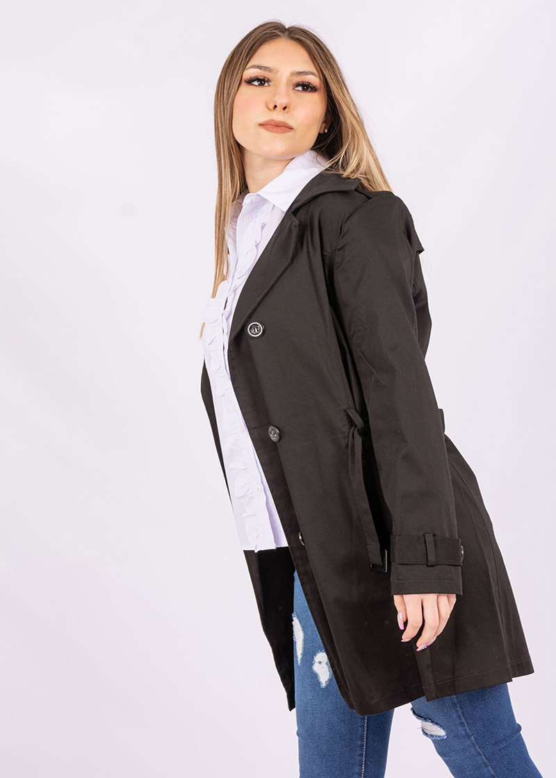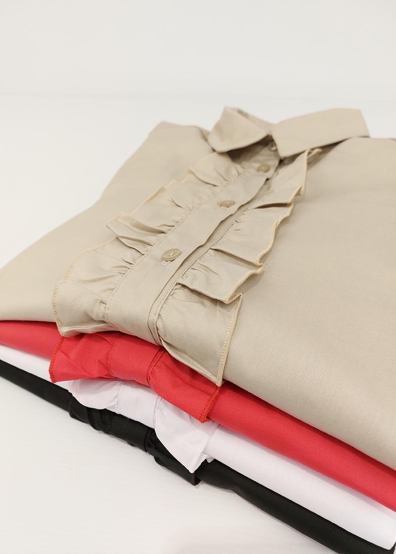 Camisa de poplin con mangas largas, cuello, y volados en la cartera. La espalda está diseñada con canesú y tabla y tiene botones al tono.