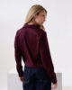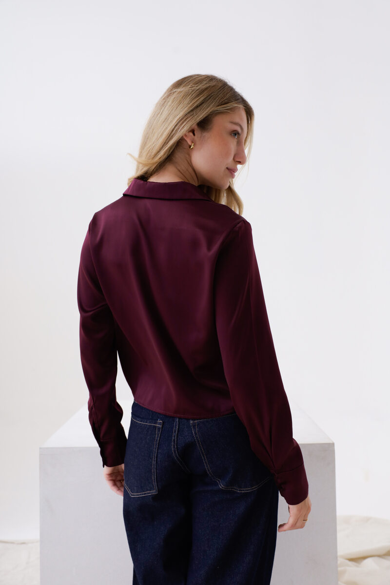 Camisa over corta mangas largas de raso, tela brillosa que no elastiza y tiene una caída liviana, cuello clásico y un pequeñas v, el cierre de la prenda nace desde el escote hacia abajo. Espalda con canesú y tabla. Tiene botones al tono en el centro de la prenda y en los puños anchos.