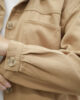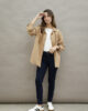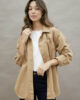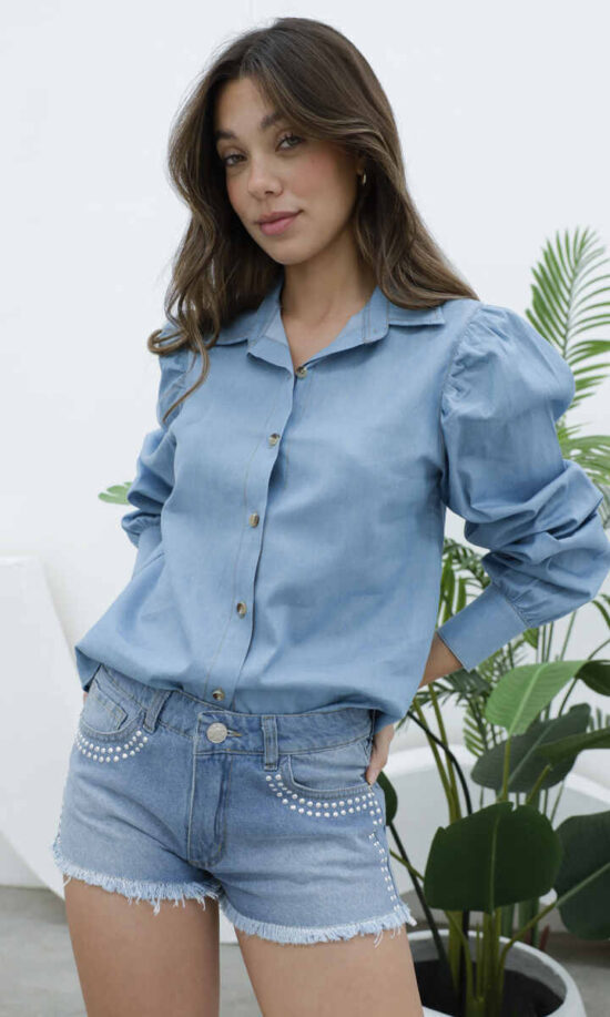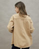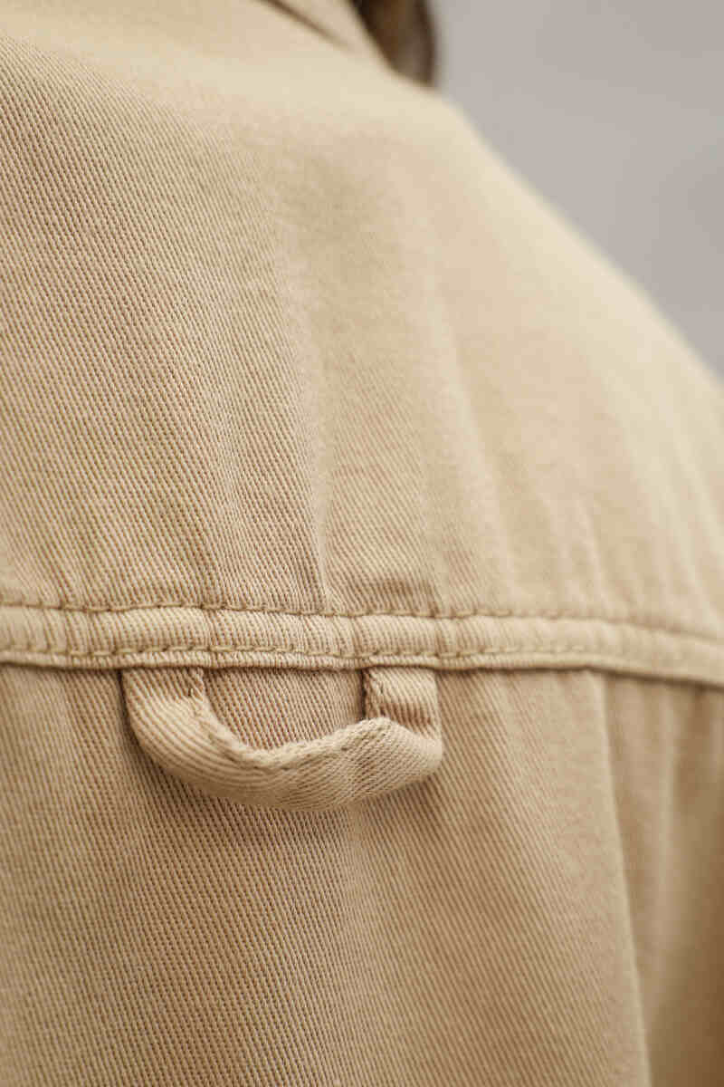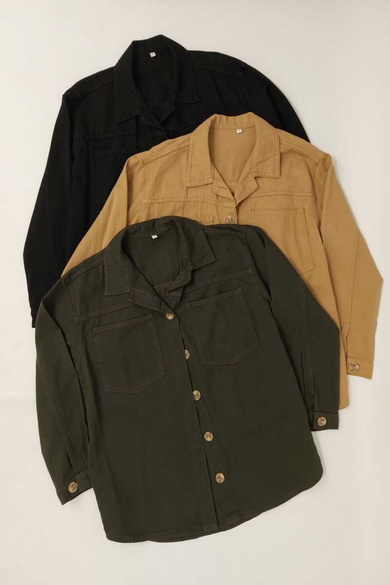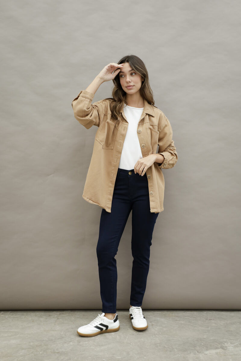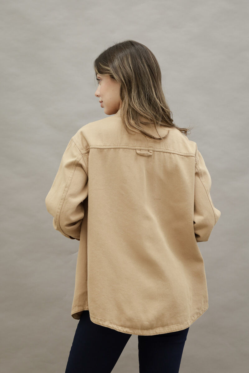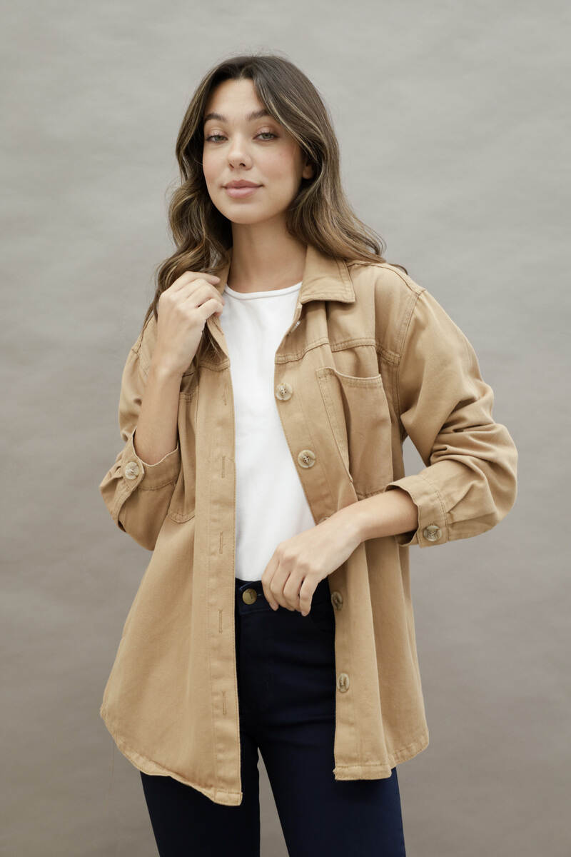 Camisaco mangas largas de gabardina, tiene dos bolsillos a la altura del busto y a los lados por la cadera, con cuello clásico y los botones en las mangas y la cartera son grandes de plástico diseño veteado.
