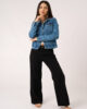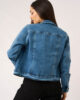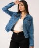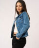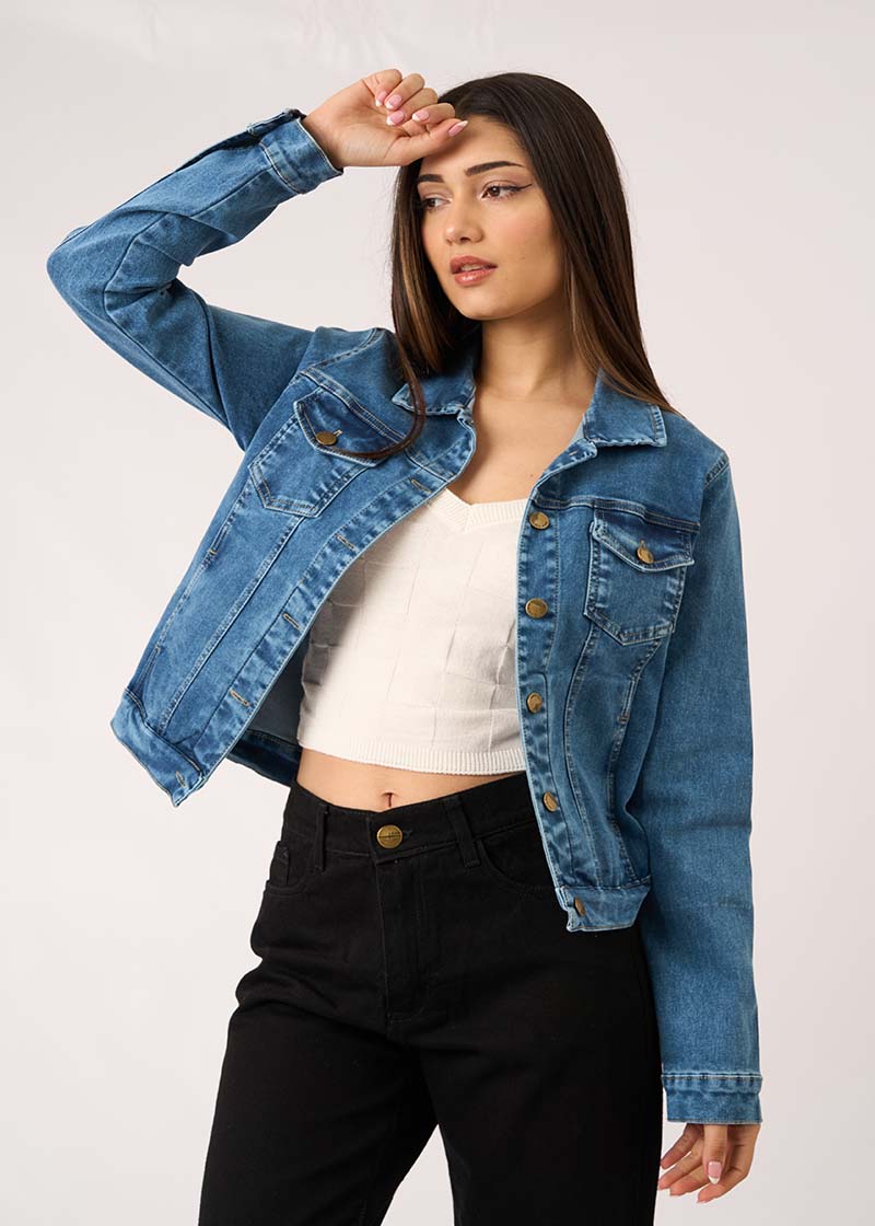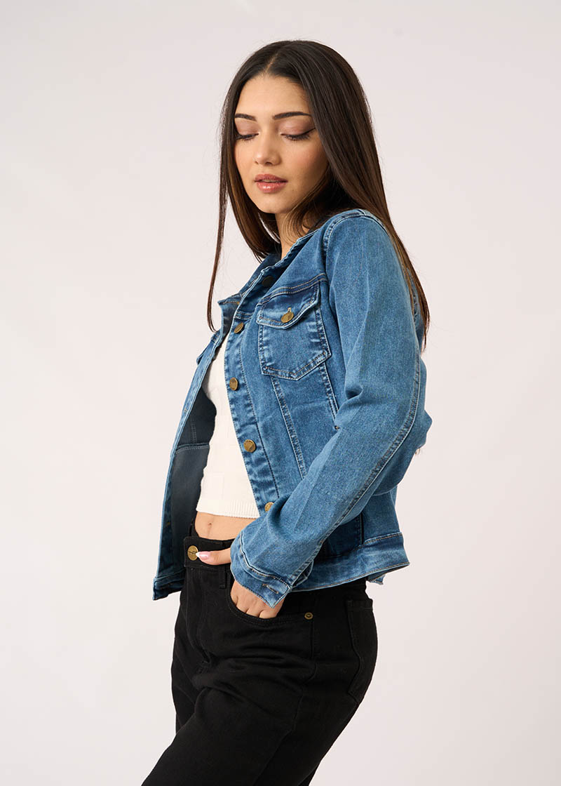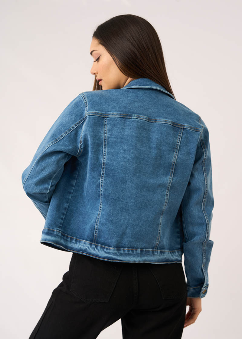 Campera jean elastizado de corte clásico con cuello y bolsillos pequeños en la altura del pecho. Tiene botones metálicos que cierran en los puños y a lo largo del frente de la prenda.