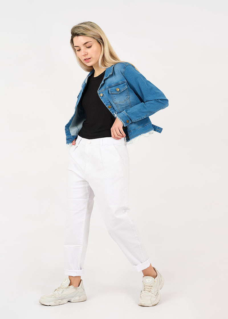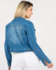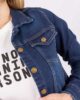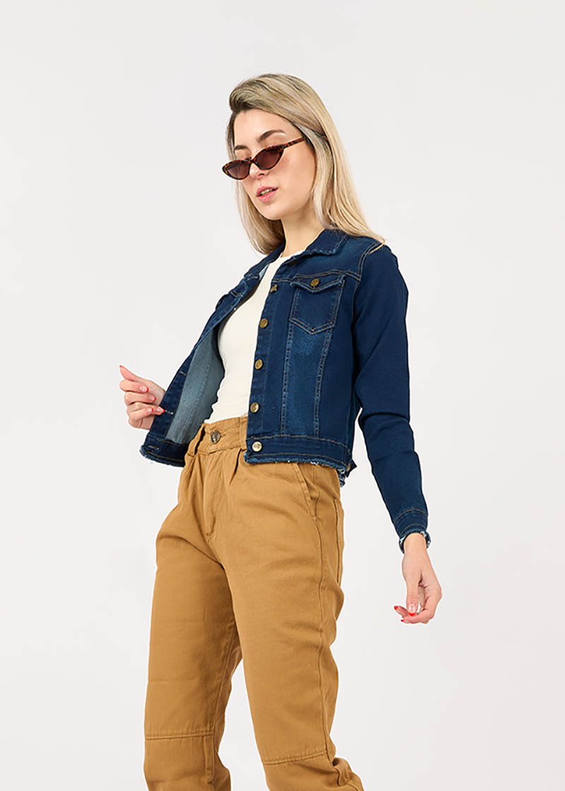 Campera jean elastizado de corte clásico con cuello y bolsillos pequeños en la altura del pecho. Tiene botones metálicos que cierran en los puños y a lo largo del frente de la prenda.