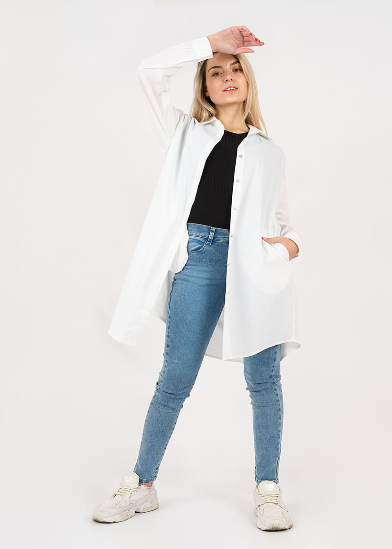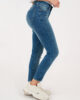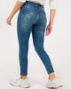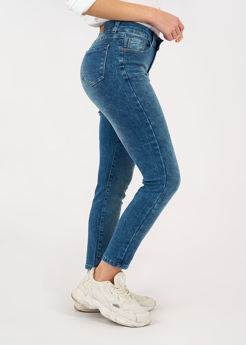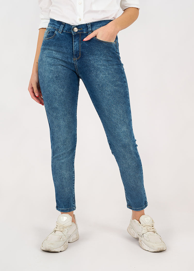 Pantalón jean elastizado con bolsillos delanteros y traseros. Tiene pasacinto, cierre y botón metálico.