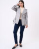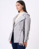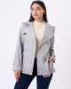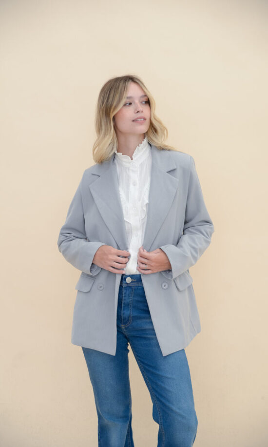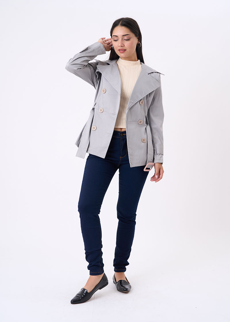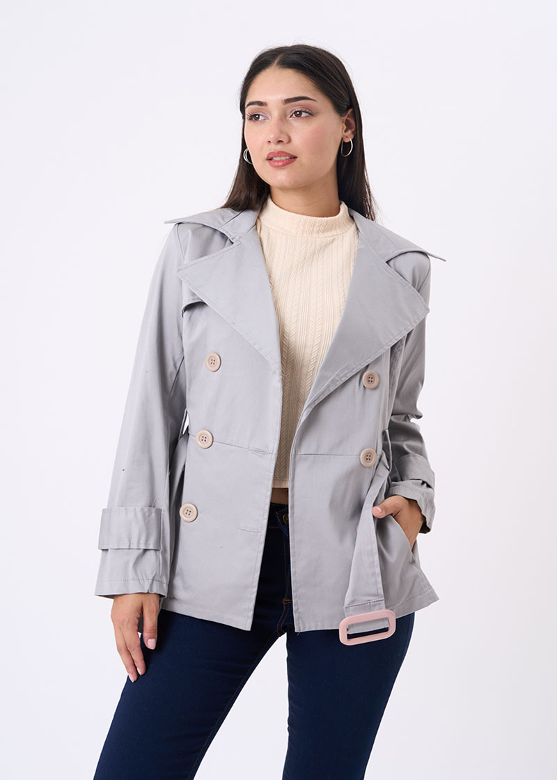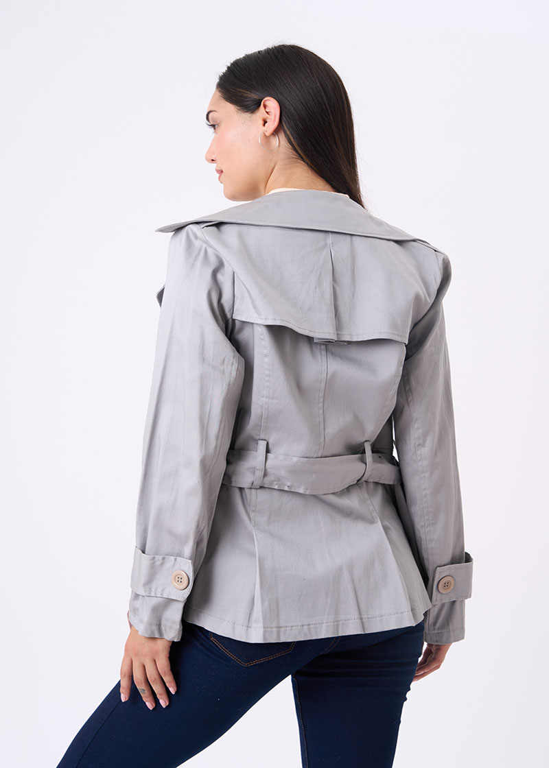 Saco cotton satin con recorte y cinto ancho con hebilla en la cintura. Tiene hombreras y seis botones que acentúan la cintura y los bolsillos delanteros son decorativos. En las mangas tiene detalle de