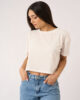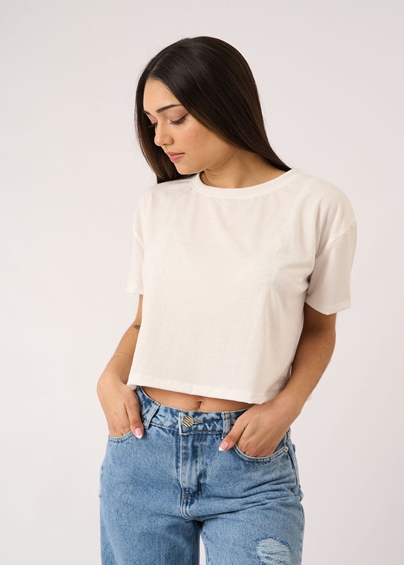 Remera con mangas cortas y cuello redondo, de algodón con poliéster. Son anchos y llegan por la cintura.