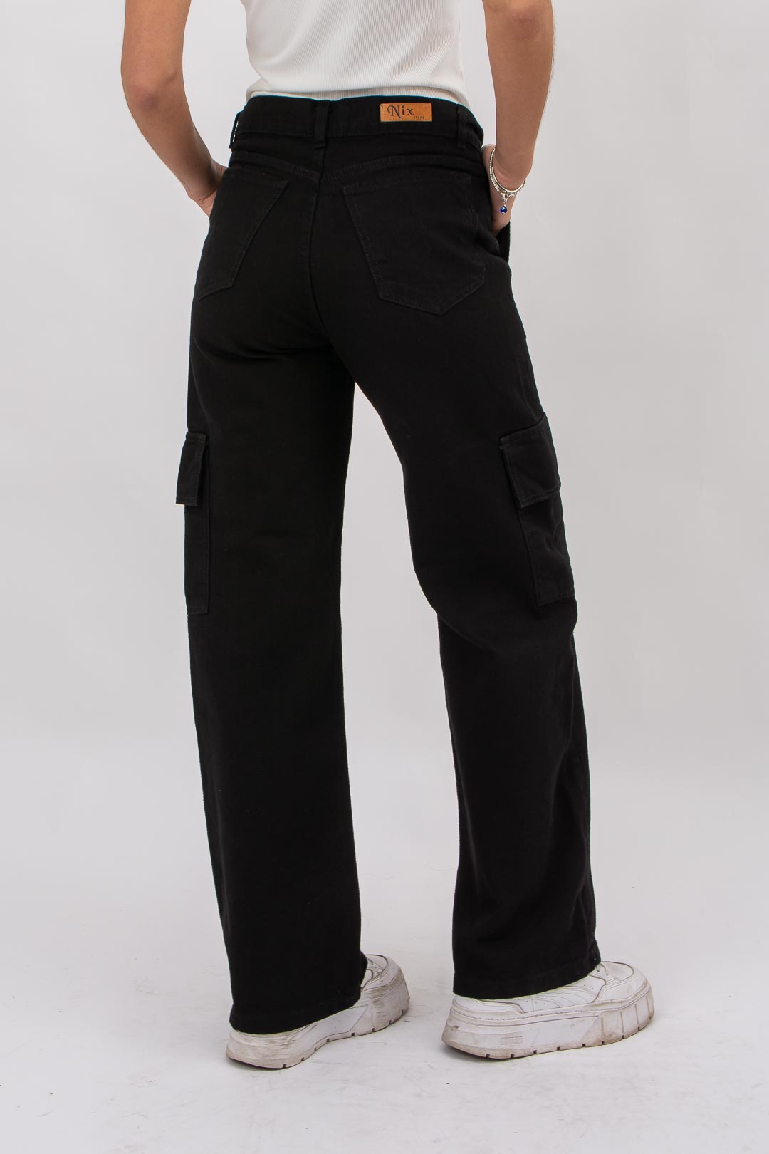 Pantalón denim piernas amplias con bolsillos delanteros, traseros, laterales. Tiene pasacinto, cierre y botón.