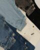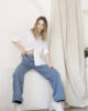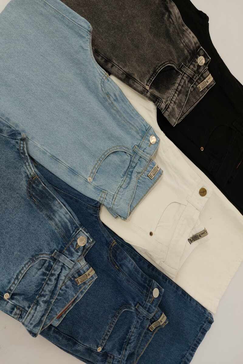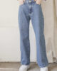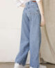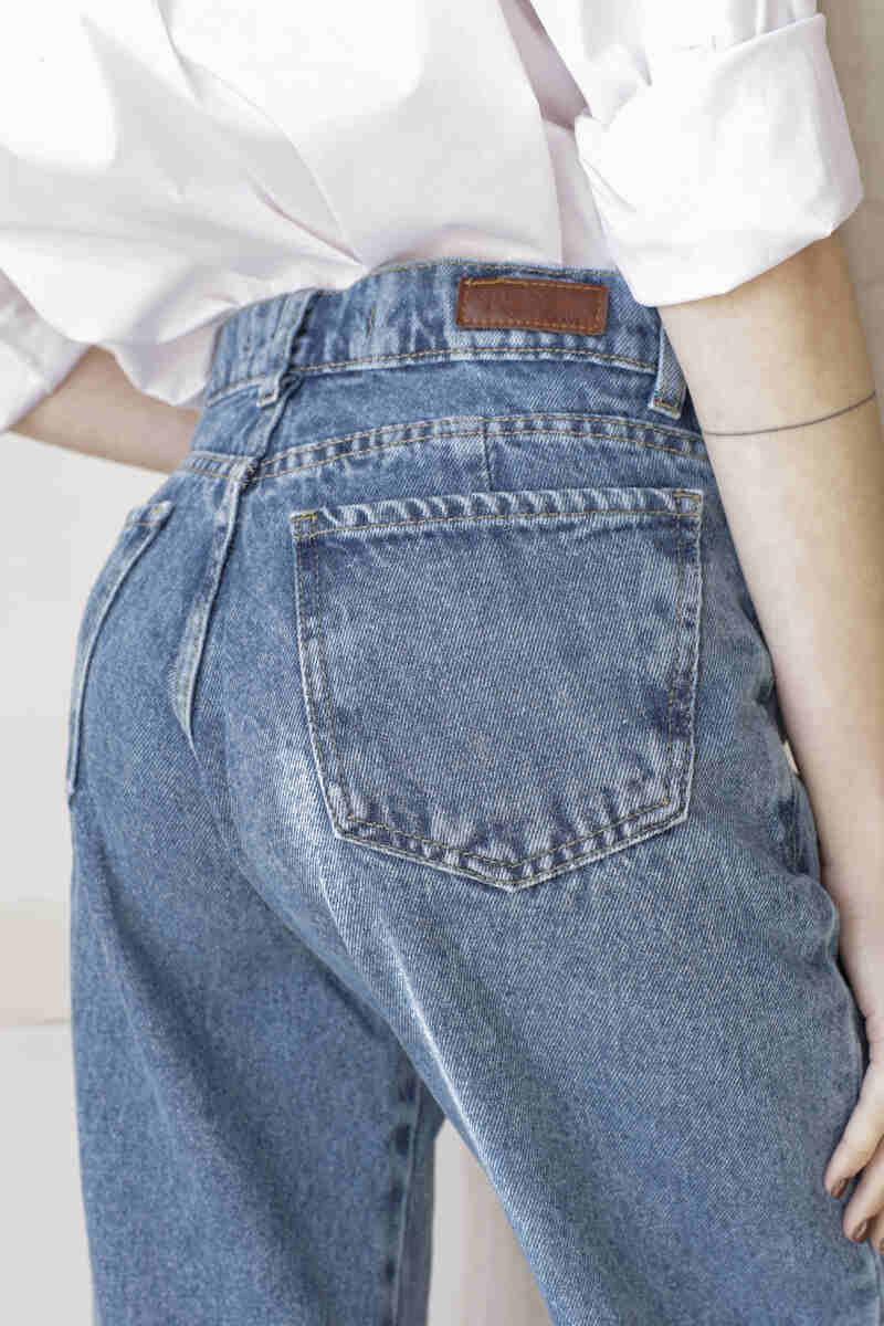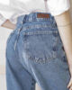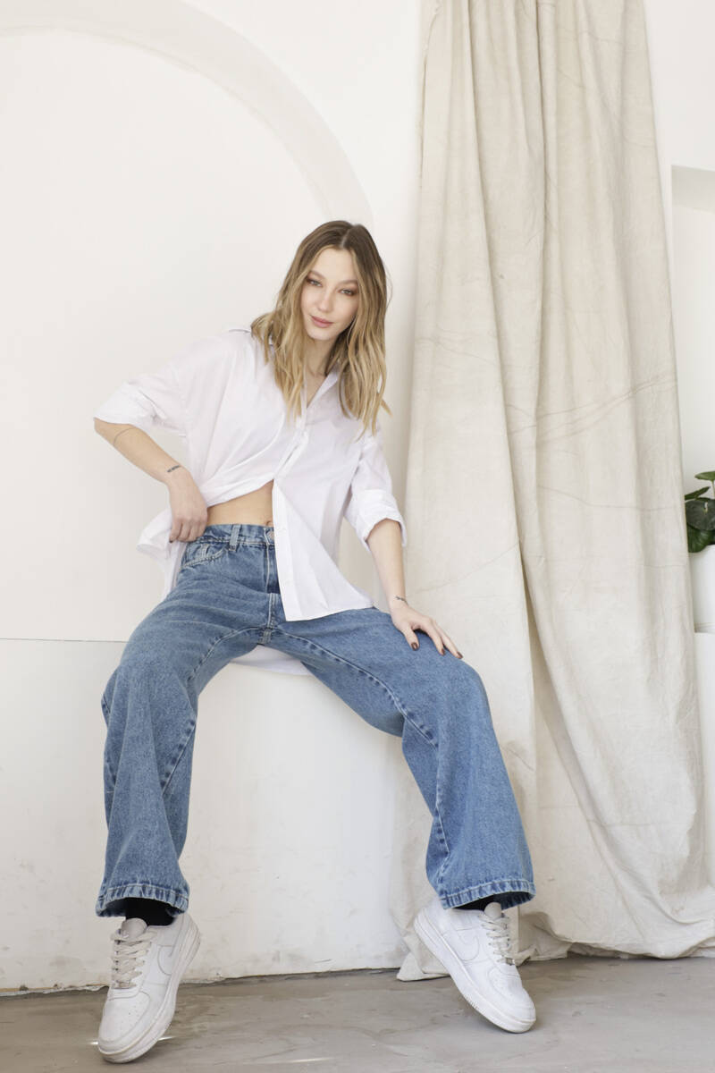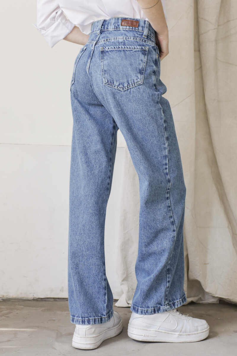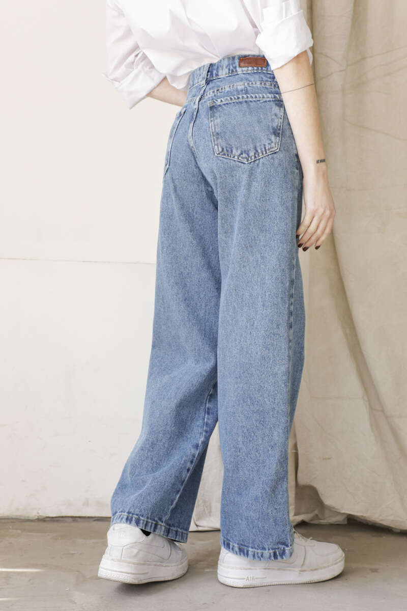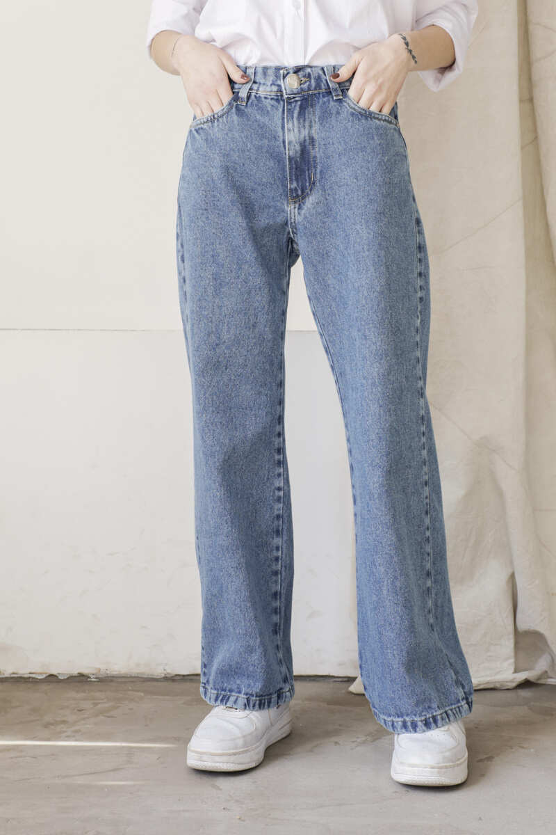 Pantalón denim piernas amplias con bolsillos delanteros y traseros. Tiene pasacinto, cierre y botón metálico.